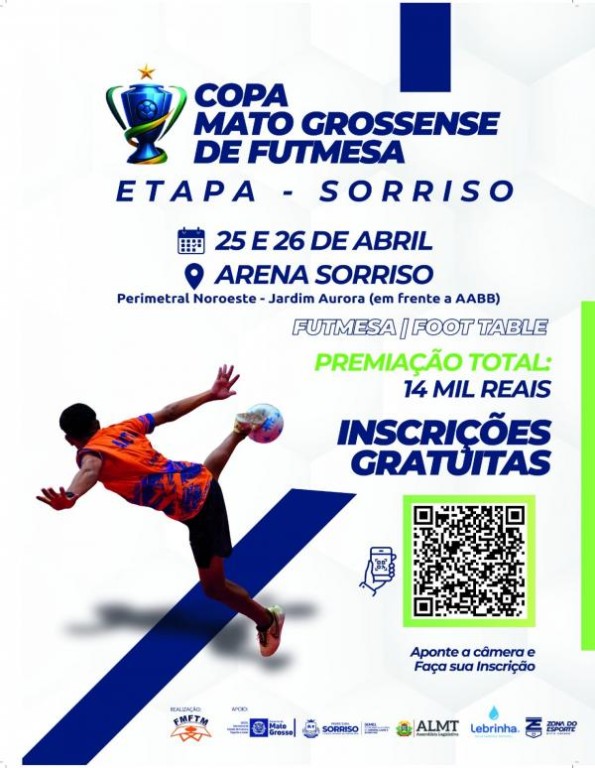 A Arena Sorriso recebe, neste fim de semana (25 e 26 de abril), uma etapa da Copa Mato-grosssense de Futmesa | Foot Table. Organizada pela Federação Mato-grossense de Futmesa, a competição será aberta às 9h de amanhã (sábado, 25 de abril), com as disputas do Sub 18.