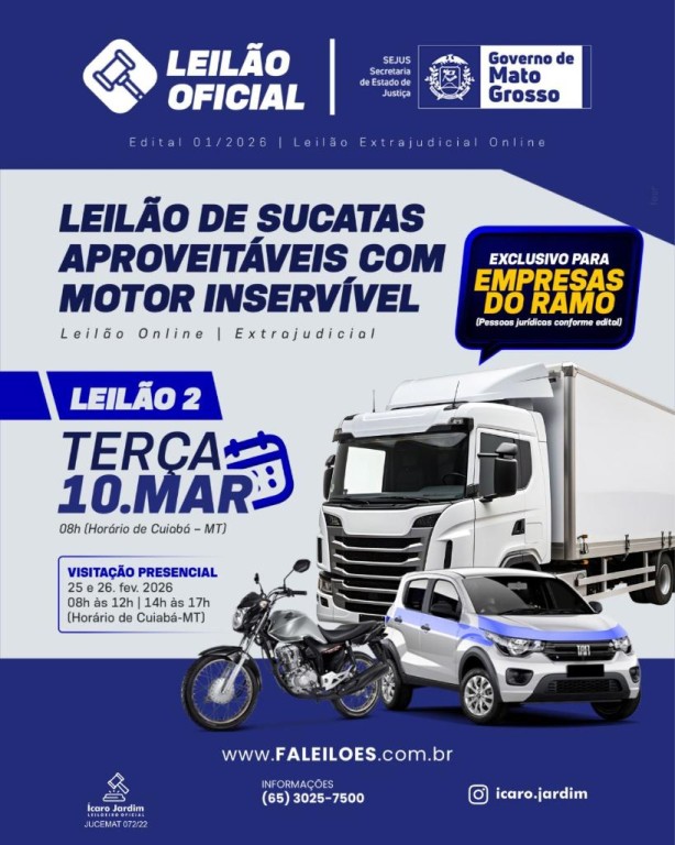 Acontece nos próximos dias 10 e 18 de março, a segunda e terceira etapas do leilão de veículos sucateados da Polícia Civil de Mato Grosso.