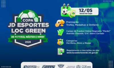 A Prefeitura de Lucas do Rio Verde, por meio da Secretaria de Esporte e Lazer, está com inscrições abertas para a Copa Municipal JD Esporte /...